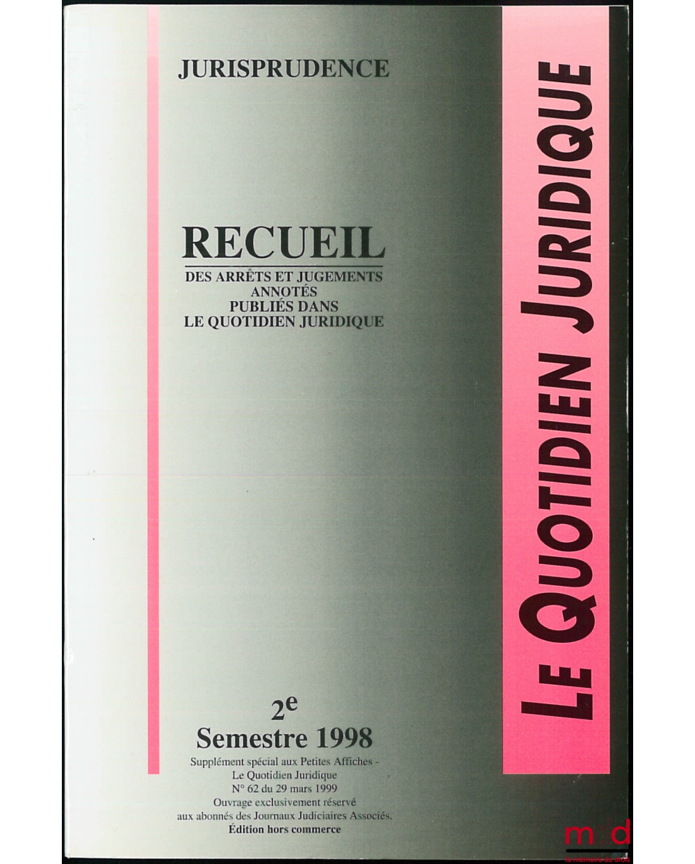 LE QUOTIDIEN JURIDIQUE, JURISPRUDENCE, Recueil des arrêts et jugements annotés publiés dans le Quotidien juridique, 2ème semestre 1998, éd. hors commerce