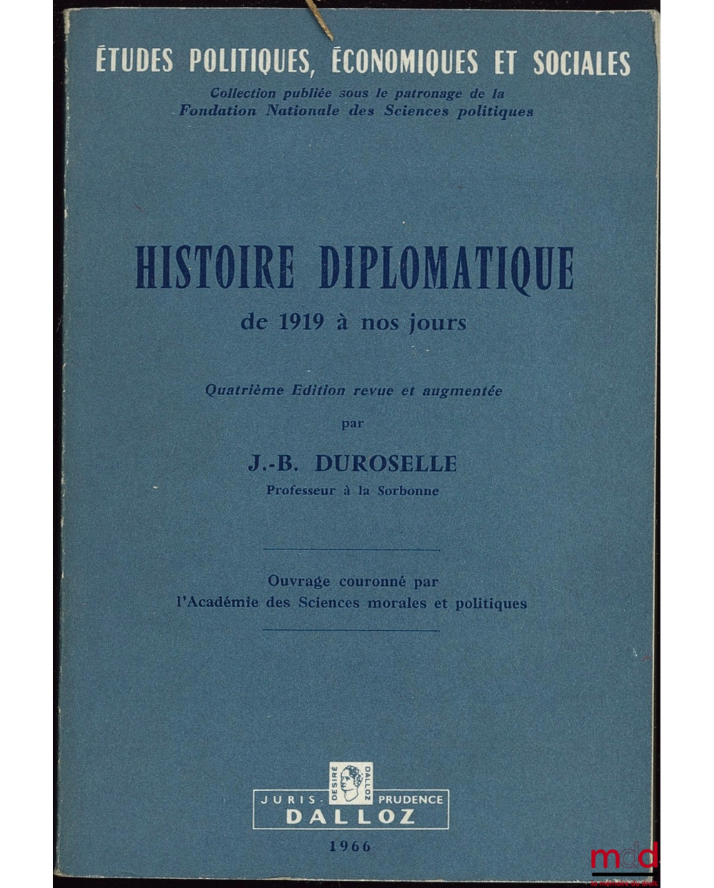 HISTOIRE DIPLOMATIQUE DE 1919 À NOS JOURS, 4ème éd. revue et augmentée, coll. Études politiques, économiques et sociales, publiée sous le patronage de la Fondation nationale des sciences politiques