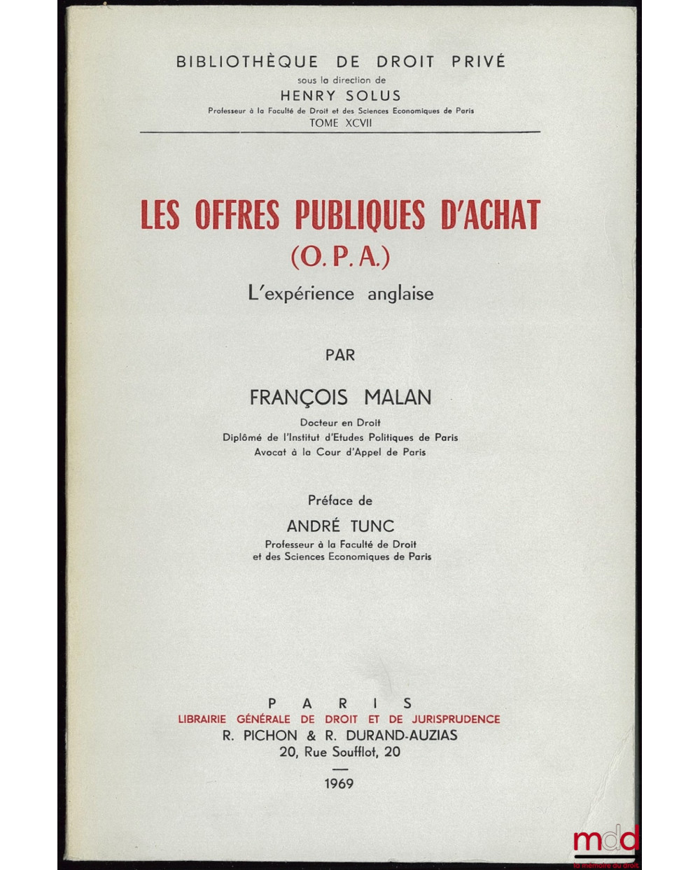 LES OFFRES PUBLIQUES D’ACHAT (O.P.A.), L’EXPÉRIENCE ANGLAISE, Préface de André Tunc, Bibl. de droit privé, t. XCVII