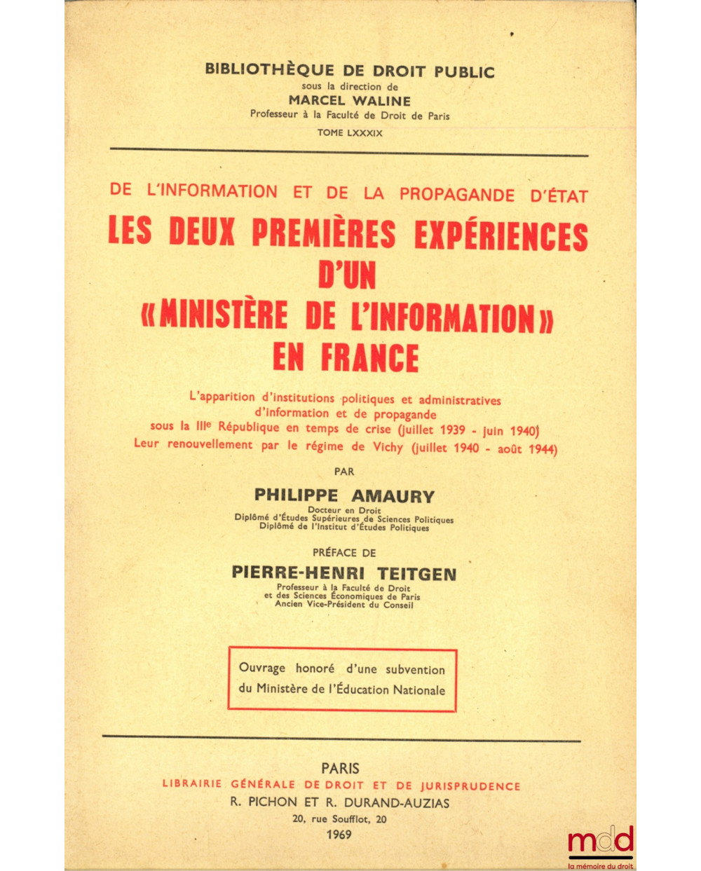 DE L’INFORMATION ET DE LA PROPAGANDE D’ÉTAT, LES DEUX PREMIÈRES EXPÉRIENCES D’UN « MINISTÈRE DE L’INFORMATION » EN FRANCE. L’apparition d’Institutions politiques et administratives d’information et de propagande sous la IIIe République en temps de crise (juillet 1939 - juin 1940) - Leur renouvellement par le régime de Vichy (juillet 1940 - août 1944), Préface de Pierre-Henri Teitgen, Bibl. de droit public, t. LXXXIX