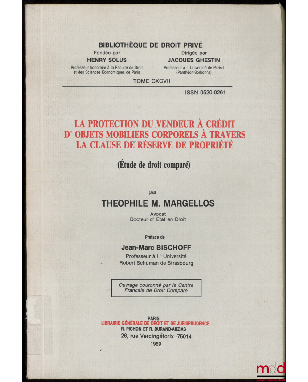 LA PROTECTION DU VENDEUR À CRÉDIT D’OBJETS MOBILIERS CORPORELS À TRAVERS LA CLAUSE DE RÉSERVE DE PROPRIÉTÉ (Étude de droit comparé), Préface de Jean-Marc Bischoff, Bibl. de droit privé, t. CXCVII