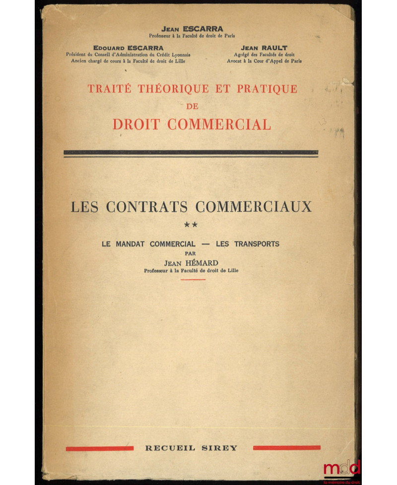TRAITÉ THÉORIQUE ET PRATIQUE DE DROIT COMMERCIAL. LES CONTRATS COMMERCIAUX, par Jean HÉMARD ;t. I : Les Ventes commerciales - Le gage commercial ;t. II : Le Mandat commercial - Les transports