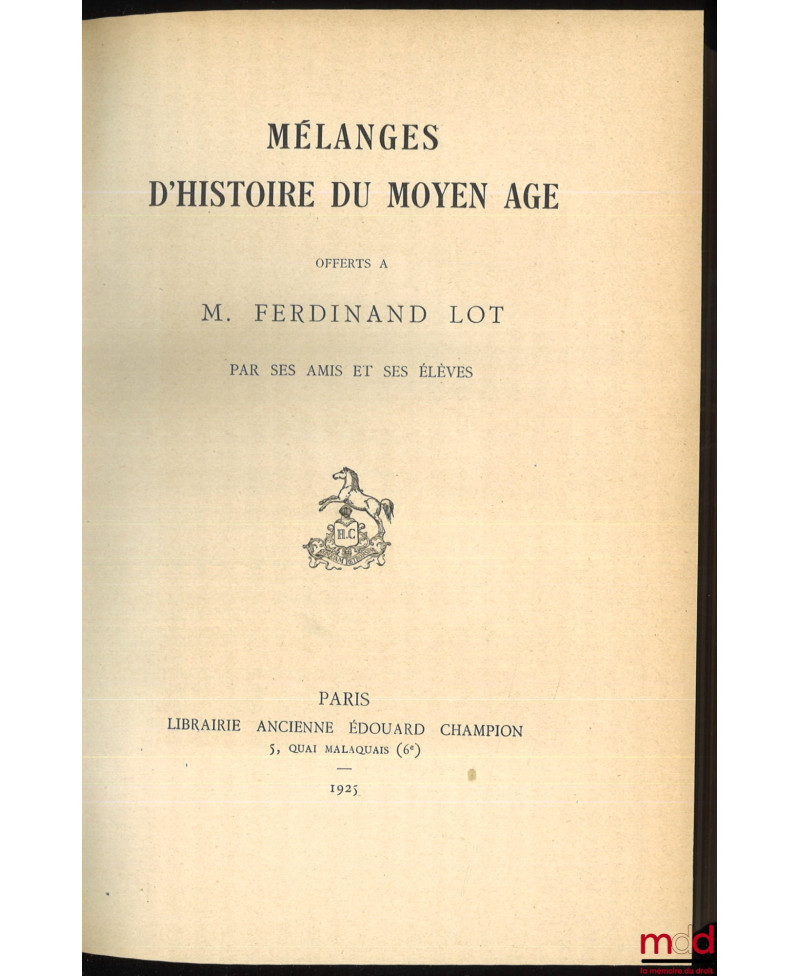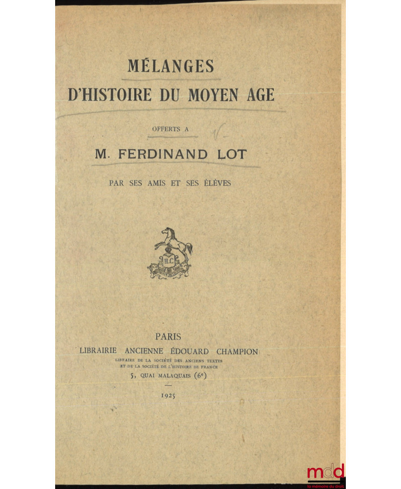 MÉLANGES D’HISTOIRE DU MOYEN ÂGE OFFERTS À M. FERDINAND LOT PAR SES AMIS ET SES ÉLÈVES