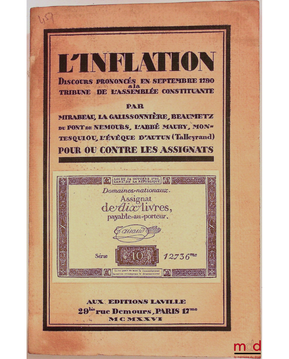 L’INFLATION, Discours prononcés en septembre 1790 à la Tribune de l’Assemblée constituante par Mirabeau, La Galissonnière, Beaumetz, du Pont de Nemours, l’Abbé Maury, Montesquiou, l’Évèque d’Autun (Talleyrand) POUR OU CONTRE LES ASSIGNATS