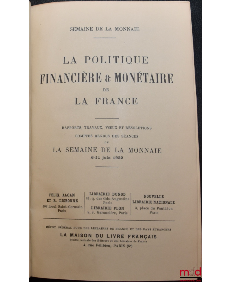 LA POLITIQUE FINANCIÈRE & MONÉTAIRE DE LA FRANCE, Rapports, travaux, voeux et résolutions, comptes rendus des séances de la semaine de la monnaie 6-11 juin 1922