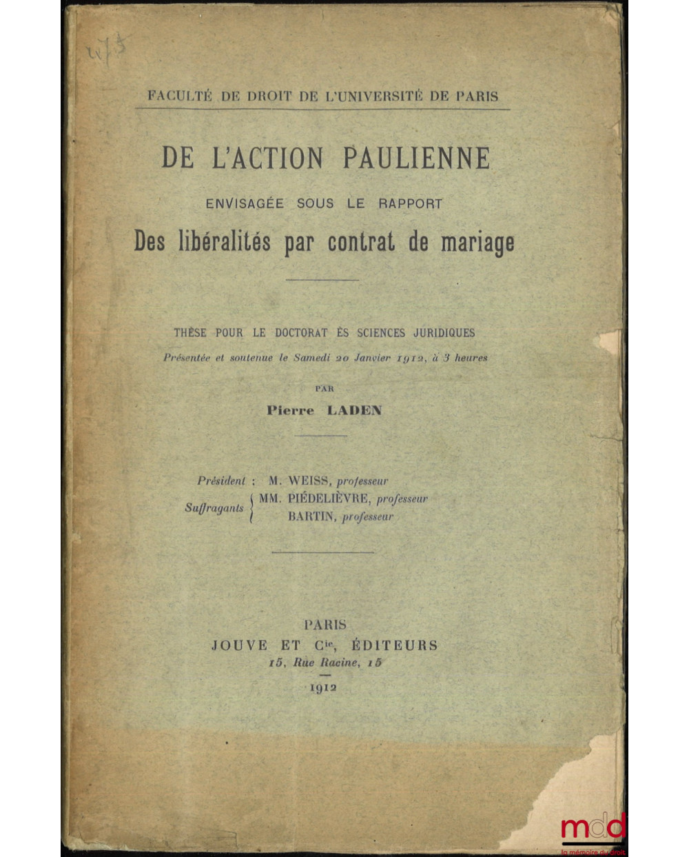 DE L’ACTION PAULIENNE envisagée sous le rapport DES LIBÉRALITÉS PAR CONTRAT DE MARIAGE, Thèse, Faculté de droit de l’Université de Paris, (Président : M. Weiss ; Suffragants : MM. Piédelièvre et Bartin)