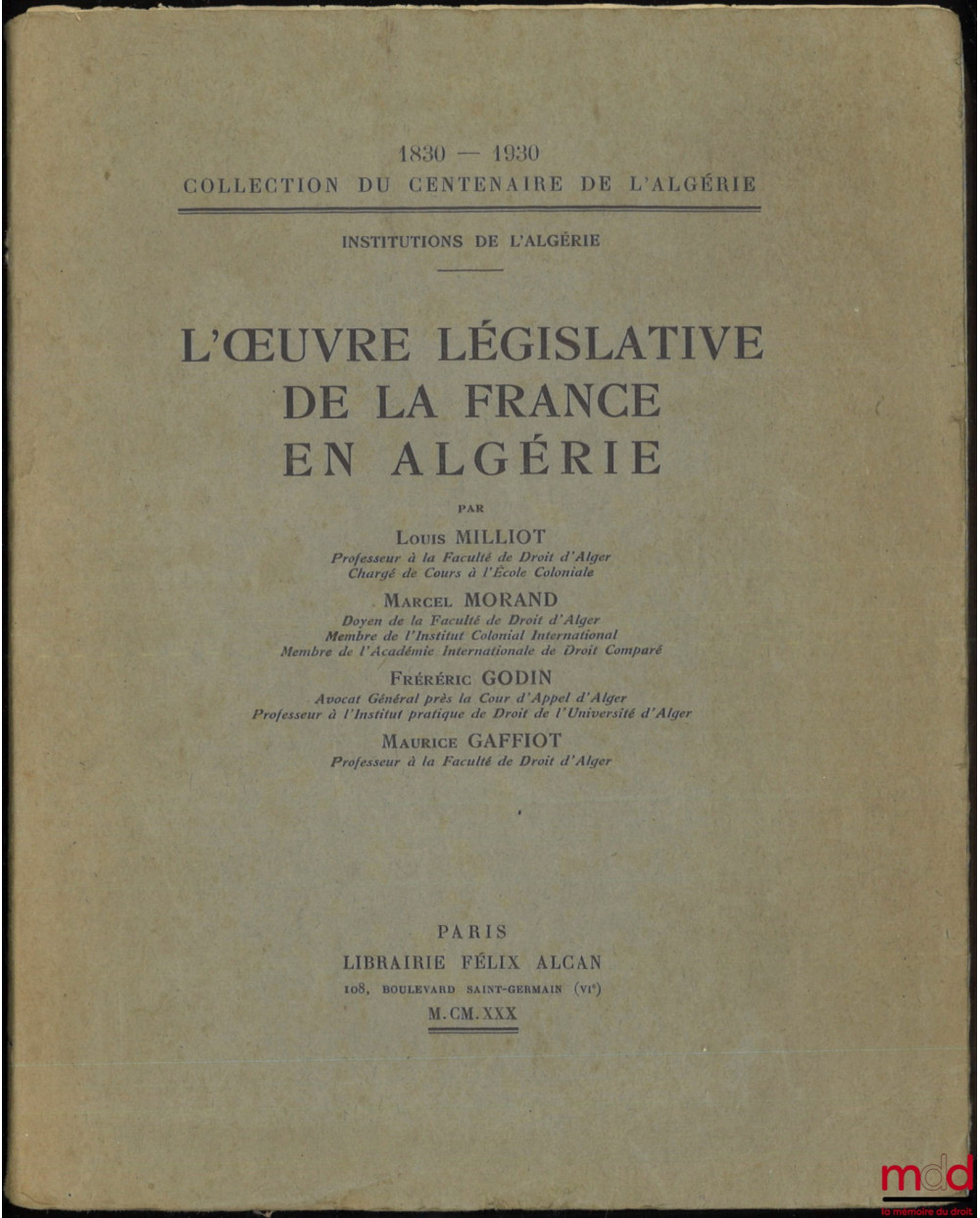 « Le gouvernement français a profité du centenaire de la prise d’Alger, pour faire le bilan de l’activité déployée en Algérie par la France au cours d’un siècle. Dans ce bilan une place importante devait être attribuée à l’œuvre législative. Quatre juristes,tous attachés à la Faculté de droit d’Alger,se sont chargés de la décrire. Ils se sont partagés la tâche de la façon suivante. En deux chapitres comprenant au total 152 pages, intitulés le premier : le gouvernement et l’administration de l’Algérie, le second : cent ans de législation algérienne, M. Louis Milliot expose l’évolution des modes de gouvernement et d’administration, le fonctionnement du pouvoir législatif et les conditions dans lesquelles les lois métropolitaines sont applicables à l’Algérie. M. Marcel Morand a. eu dans son lot les institutions, judiciaires, institutions complexes à raison de la compétence réservée en matière de statut personnel aux juridictions indigènes. M. Frédéric Godin s’est occupé du régime foncier de l’Algérie au point de vue juridique. Il montre par quel travail lent mais continu, la métropole est parvenue à substituer dans la majeure partie du territoire, le régime de la propriété individuelle, condition essentielle du progrès économique, à la propriété communautaire, régime favori du droit musulman. Dans : l’évolution du régime douanier de l’Algérie depuis 1830, M. Maurice Gaffiot nous marque les étapes de la politique commerciale de la France en Algérie qui, partant d’une législation de caractère colonial, est arrivée par la loi du 13 avril 1928 à soumettre l’Algérie en matière douanière aux mêmes dispositions que la France elle-même. (…) Leur œuvre n’en a pas moins un caractère scientifique ; s’ils ne disent pas tout, ils ne disent cependant que des choses vraies. Les coloniaux de tous les pays leur seront reconnaissants d’avoir publié un ouvrage clair, commode à manier, qui constitue une excellente introduction à un exposé approfondi de l’administration et du droit algérien. » (Charles Lannoy, Revue belge de philologie et d’histoire, fasc. 1-2/1931, p. 296 et s.).