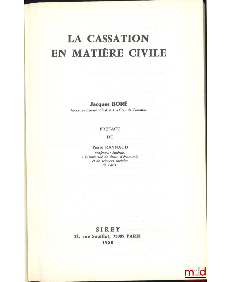 LA CASSATION EN MATIÈRE CIVILE, Préface de Pierre Raynaud, avec mise à jour au 1er oct. 1981