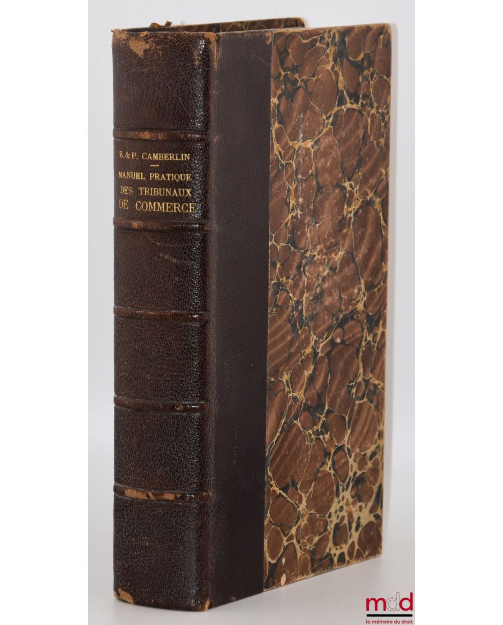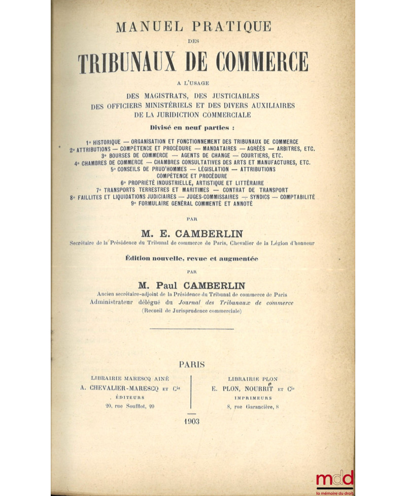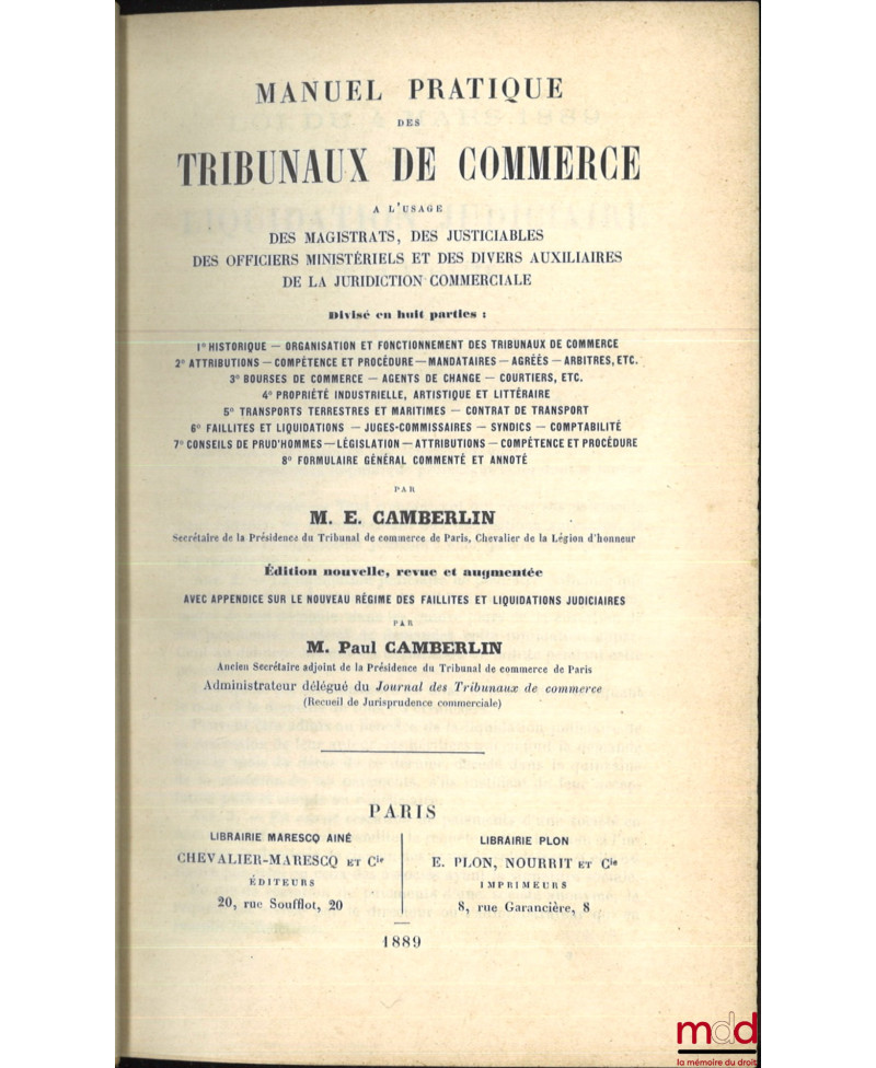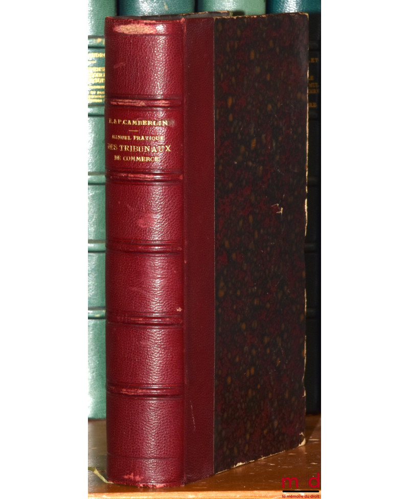 MANUEL PRATIQUE DES TRIBUNAUX DE COMMERCE à l’usage des Magistrats, des Justiciables, des Officiers ministériels et des divers auxiliaires de la Juridiction commerciale, divisé en huit parties : 1° Historique - Organisation et fonctionnement des tribunaux de commerce ; 2° Attributions - Compétence et procédure - Mandataires - Agréés - Arbitres, etc. ; 3° Bourses de commerce - Agents de change - Courtiers, etc. ; 4° Propriété industrielle, artistique et littéraire ; 5° Transports terrestres et maritimes - Contrat de transport ; 6° Faillites et liquidations judiciaires - Juges-commissaires - Syndics - Comptabilité ; 7° Conseils de Prud’hommes - Législation - Attributions - Compétence et procédure ; 8° Formulaire général commenté et annoté, Éd. nouvelle, revue et augmentée avec appendice sur le nouveau régime des faillites et liquidations judiciaires