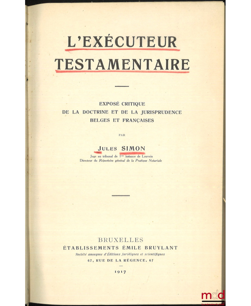 L’EXÉCUTEUR TESTAMENTAIRE, Exposé critique de la doctrine et de la jurisprudence belges et françaises