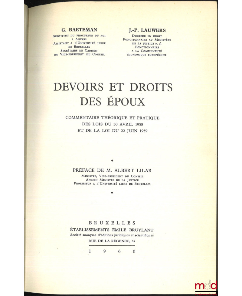 DEVOIRS ET DROITS DES ÉPOUX, Commentaire théorique et pratique des lois du 30 avril 1958 et de la loi du 22 juin 1959, Préface de Albert Lilar