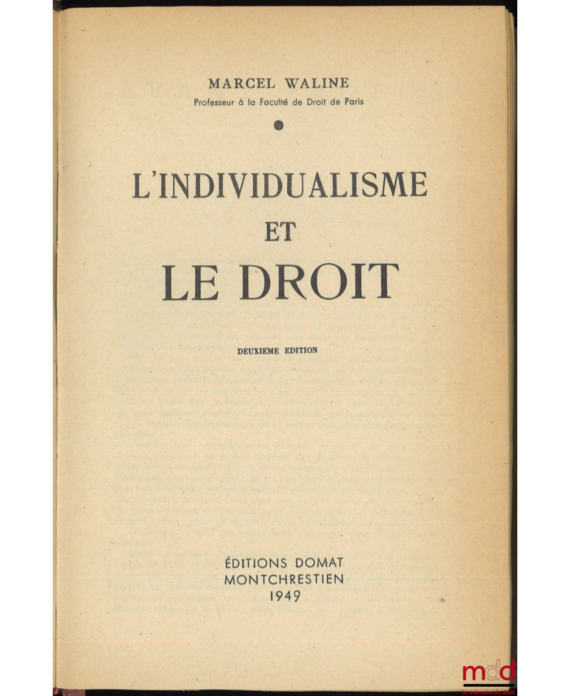 Ce livre est la reprise d’un cours professé par l’auteur à la faculté de droit de Paris en 1943-44 ; première partie : l’individu est-il la fin du droit (doctrine affirmant que l’individu est la fin du droit, doctrine niant que l’individu soit la fin du droit), deuxième partie les sources individuelles ou sociales du droit, (avec notamment un chapitre exceptionnel sur la création de droits subjectifs par les volontés individuelles dans le contrat), troisième partie les institutions juridiques inspirées de l’individualisme politique (la conception individualiste de la propriété, les droits de l’homme et la liberté publique, la limitation de l’État par le droit…). Rare.