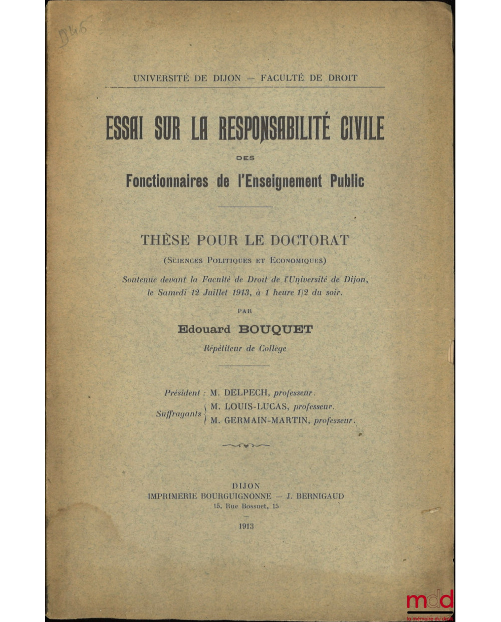 ESSAI SUR LA RESPONSABILITÉ CIVILE DES FONCTIONNAIRES DE L’ENSEIGNEMENT PUBLIC, Université de Dijon - Faculté de droit, Thèse (Président : M. Delpech ; Suffragants : M. Louis-Lucas et M. Germain-Martin)
