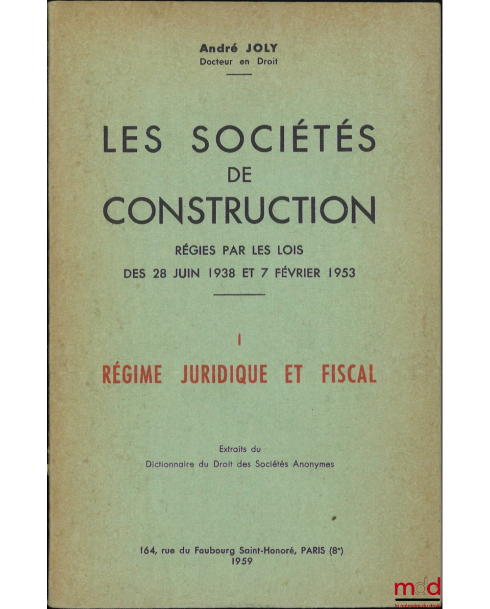 LES SOCIÉTÉS DE CONSTRUCTION RÉGIES PAR LES LOIS DES 28 JUIN 1938 ET 7 FÉVRIER 1953, Extraits du Dictionnaire de Droit des Sociétés Anonymes, t. I : Régime juridique et fiscal, [mq. t. II]