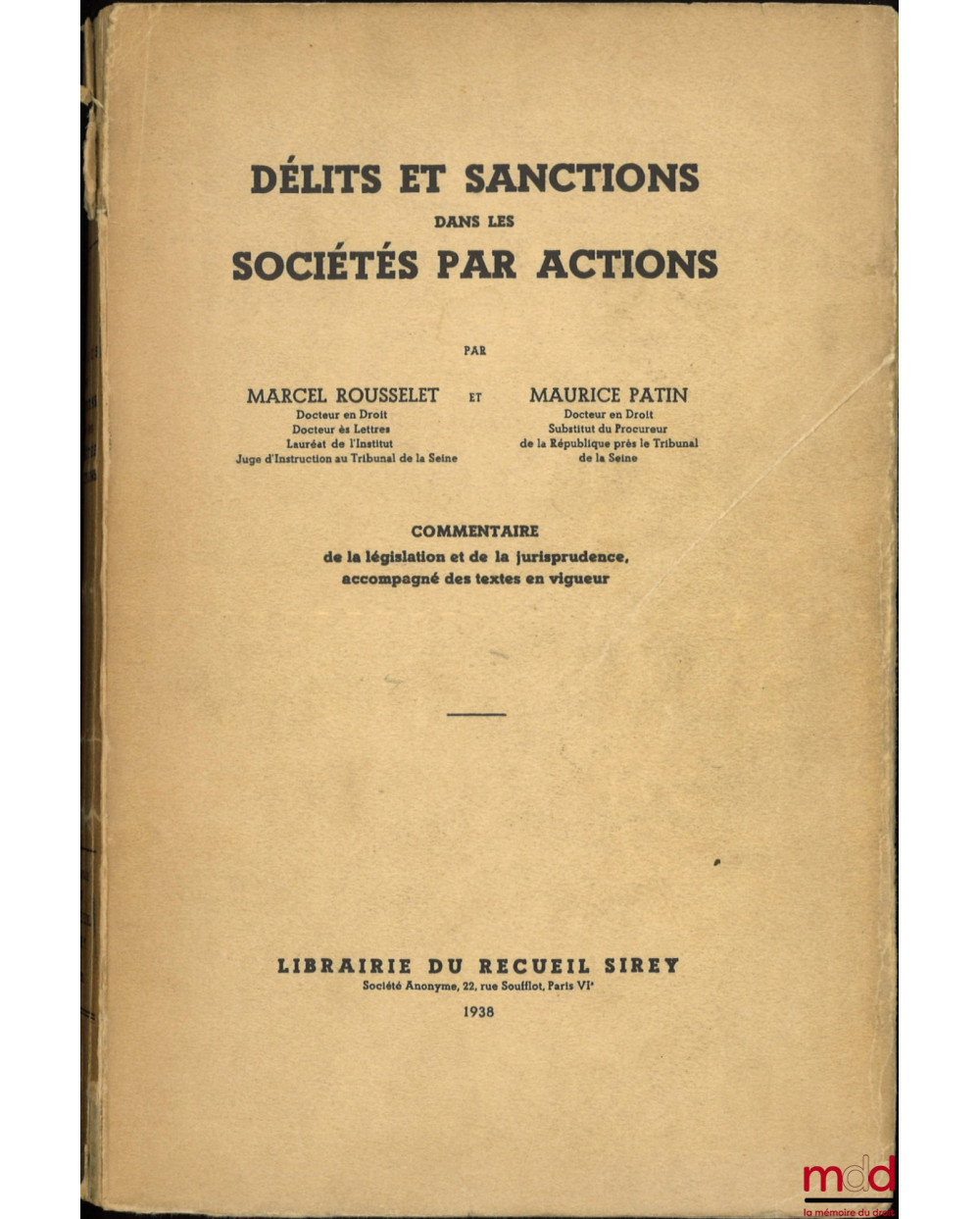 DÉLITS ET SANCTIONS DANS LES SOCIÉTÉS PAR ACTIONS, Commentaire de la législation et de la jurisprudence accompagné des textes en vigueur