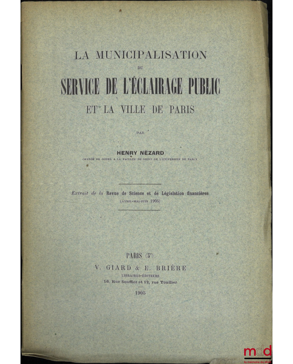 LA MUNICIPALISATION DU SERVICE DE L’ÉCLAIRAGE PUBLIC ET LA VILLE DE PARIS, Extrait de la Revue de Science et de Législation financières (avril-mai-juin 1905)