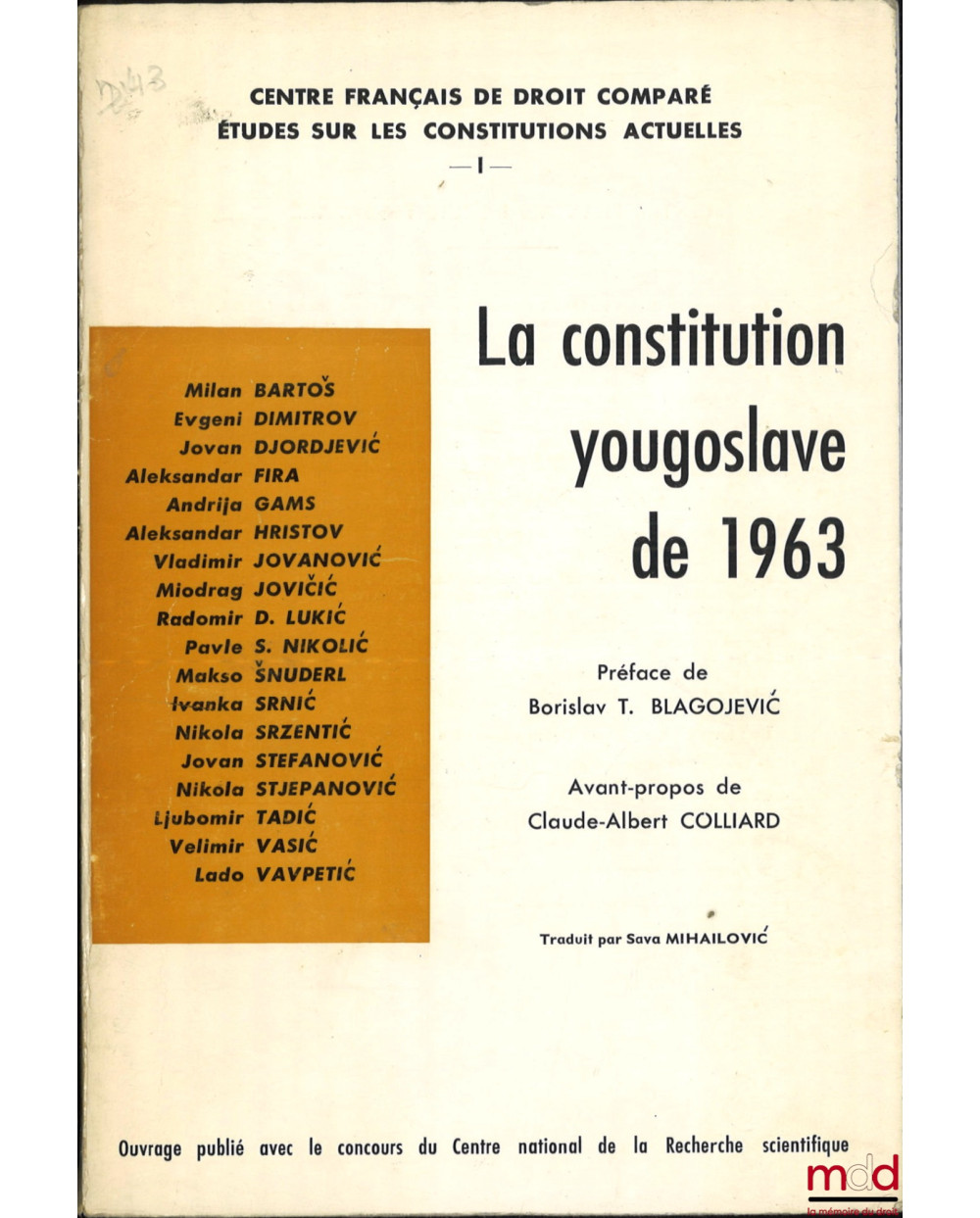 LA CONSTITUTION YOUGOSLAVE DE 1963, Préface de Borislav T. Blagojevic, Avant-propos de Claude-Albert Colliard, Traduit par Sava Mihailovic, Coll. Centre Français de Droit Comparé Études sur les Constitutions actuelles, n° I