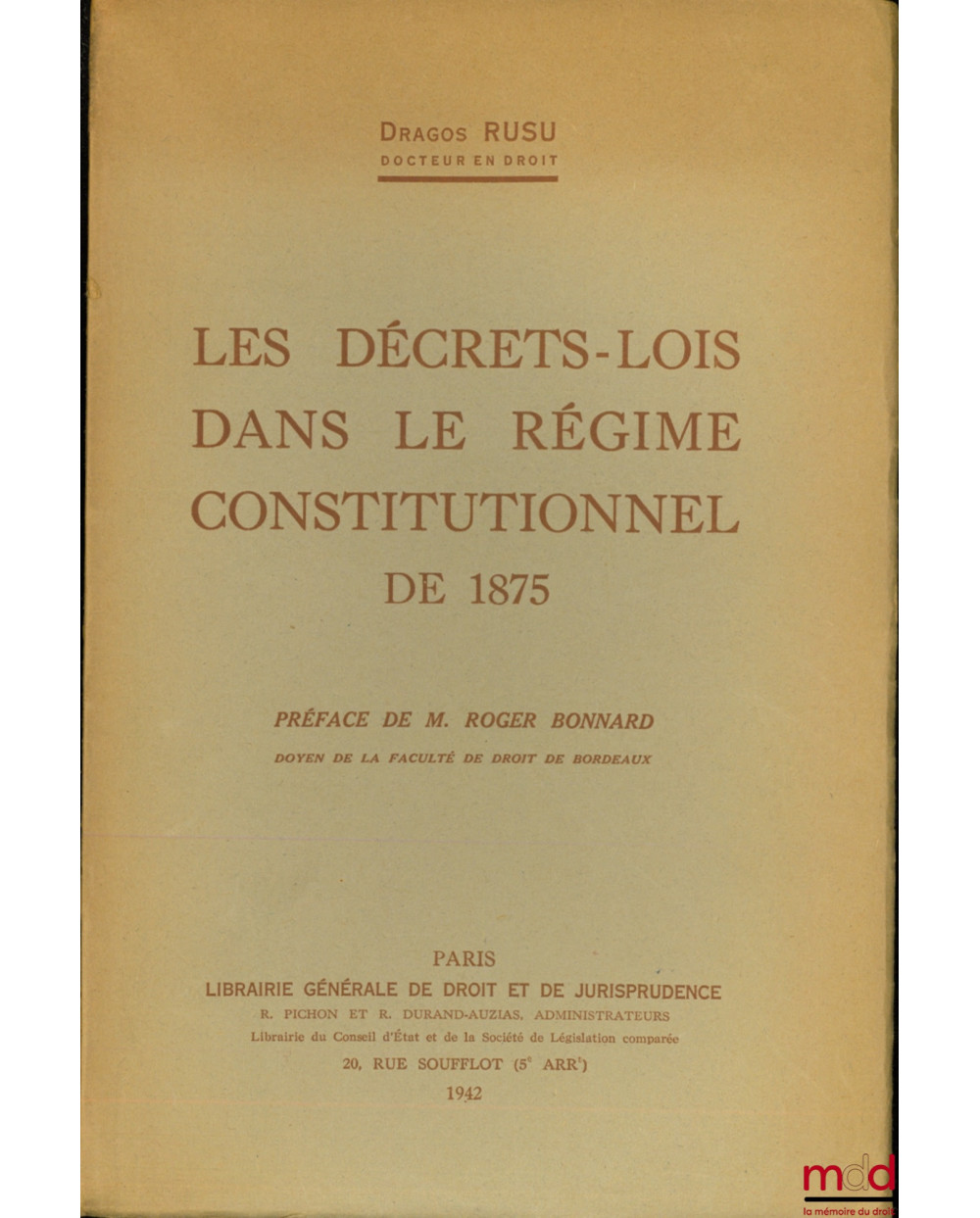 LES DÉCRETS-LOIS DANS LE RÉGIME CONSTITUTIONNEL DE 1875, Préface de M. Roger Bonnard