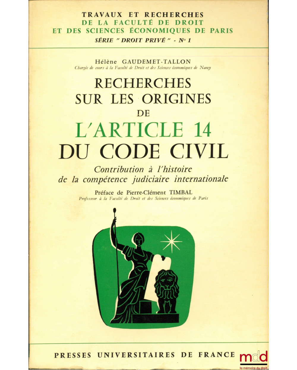 RECHERCHES SUR LES ORIGINES DE L’ARTICLE 14 DU CODE CIVIL - Contribution à l’histoire de la compétence judiciaire internationale, Préface de Pierre-Clément Timbal, coll. Travaux et recherches de la faculté de droit et des Sciences Économiques de Paris, série “Droit Privé” n° 1
