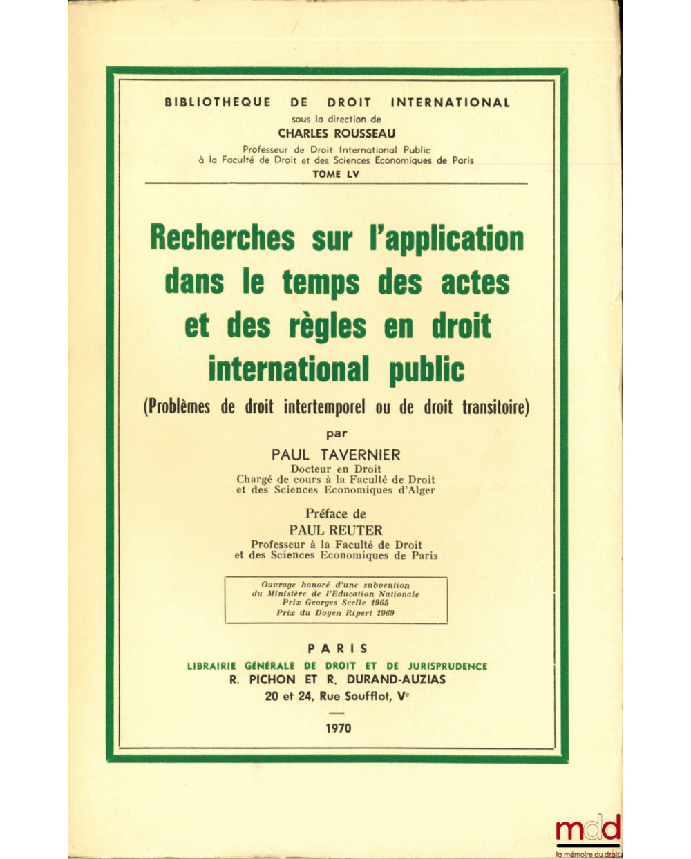 RECHERCHES SUR L’APPLICATION DANS LE TEMPS DES ACTES ET DES RÈGLES EN DROIT INTERNATIONAL PUBLIC (Problèmes de droit intertemporel ou de droit transitoire), Préface de Paul Reuter, Bibl. de droit intern., t. LV