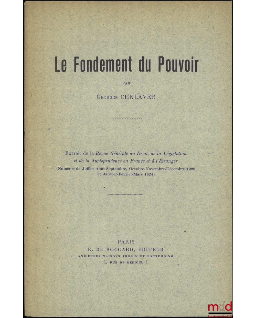 LE FONDEMENT DU POUVOIR, Extrait de la Revue Générale du Droit, de la Législation et de la Jurisprudence en France et à l’Étranger (Numéros de Juillet-Août-Septembre, Octobre-Novembre-Décembre 1923 et Janvier-Février-Mars 1924)
