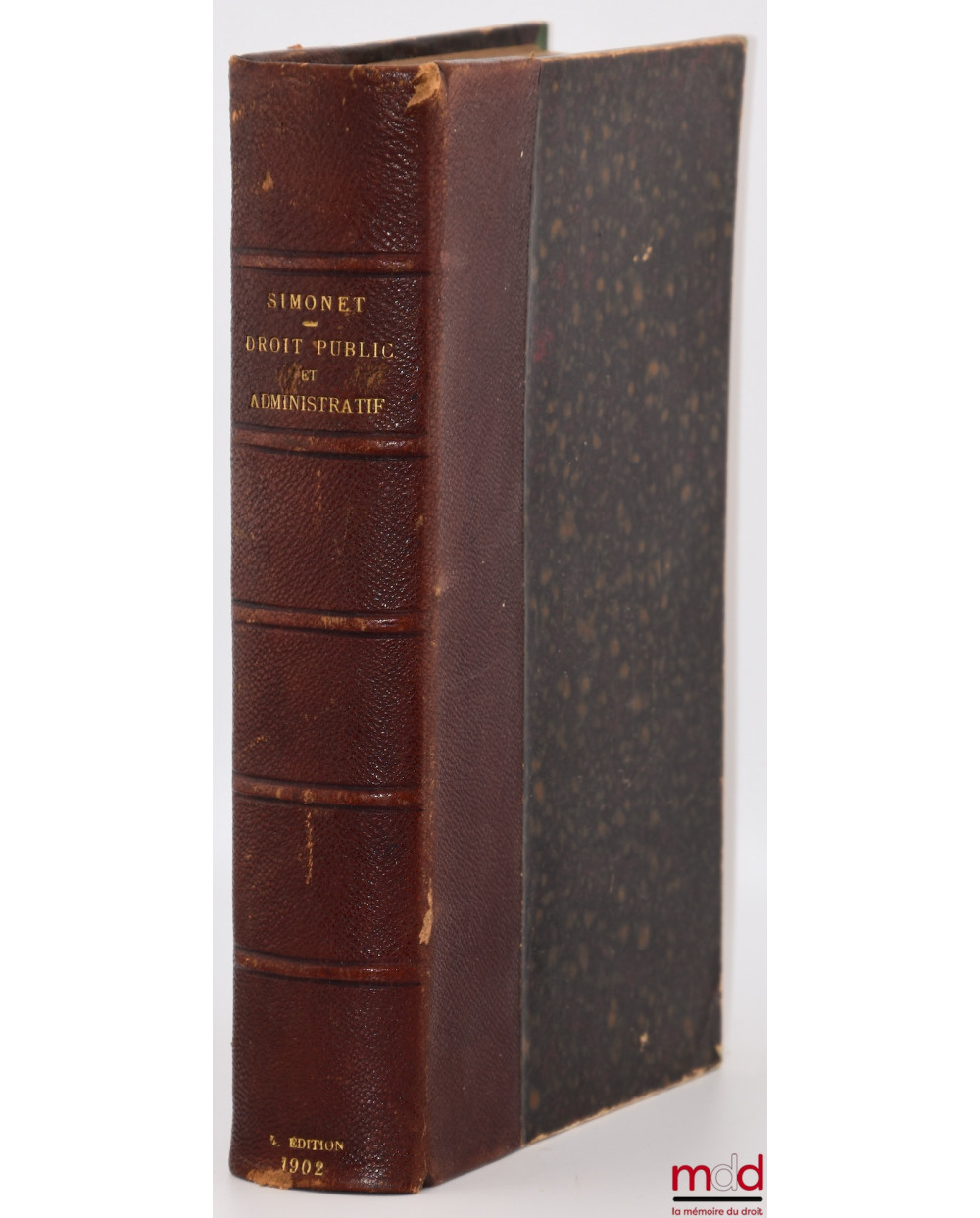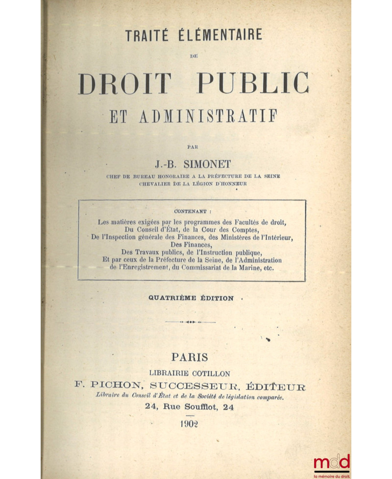 TRAITÉ ÉLÉMENTAIRE DE DROIT PUBLIC ET ADMINISTRATIF, Contenant les matières exigées par les programmes des facultés de droit, du Conseil d’État, de la Cour des comptes, des ministères de l’intérieur, des finances, des travaux publics, de l’instruction publique, et par ceux de la préfecture de la Seine, de l’administration de l’enregistrement, du Commissariat de la Marine, etc., 4e éd.