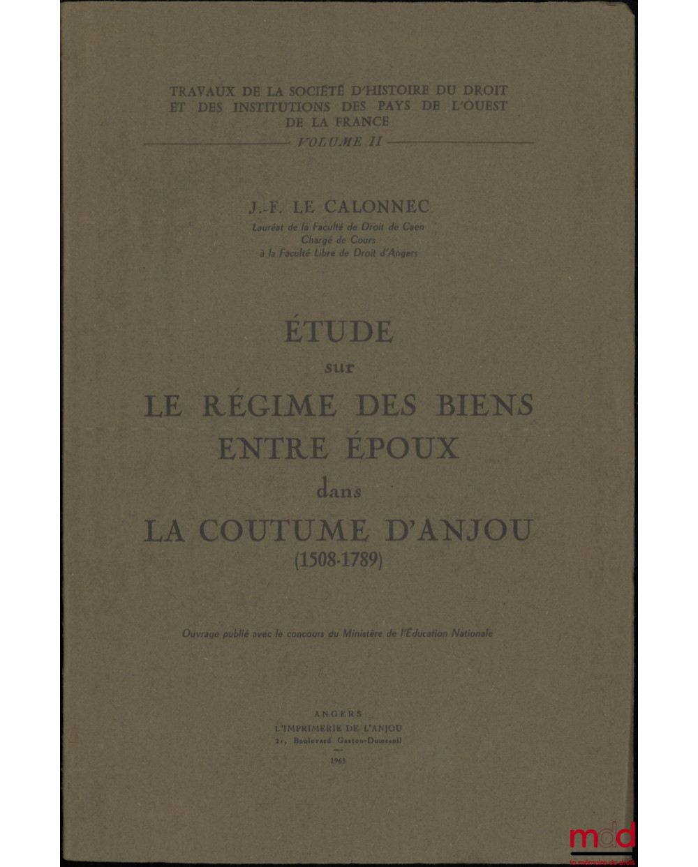 ÉTUDE SUR LE RÉGIME DES BIENS ENTRE ÉPOUX DANS LA COUTUME D’ANJOU (1508-1789), Travaux de la société d’Histoire du droit et des institutions des pays de l’ouest de la France, vol. II