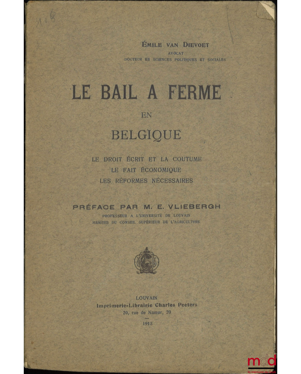 LE BAIL À FERME EN BELGIQUE, Le droit écrit et la coutume, Le fait économique, Les réformes nécessaires, Préface de E. Vliebergh
