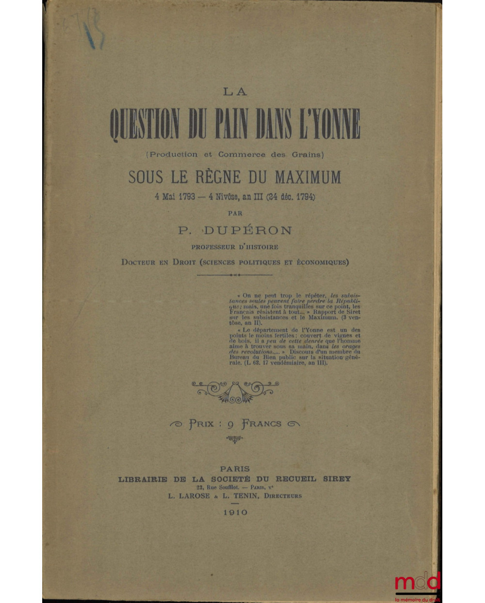 LA QUESTION DU PAIN DANS L’YONNE (Production et commerce des grains) sous le règne du maximum, 4 mai 1793 - 4 Nivôse, an III (24 déc. 1794)