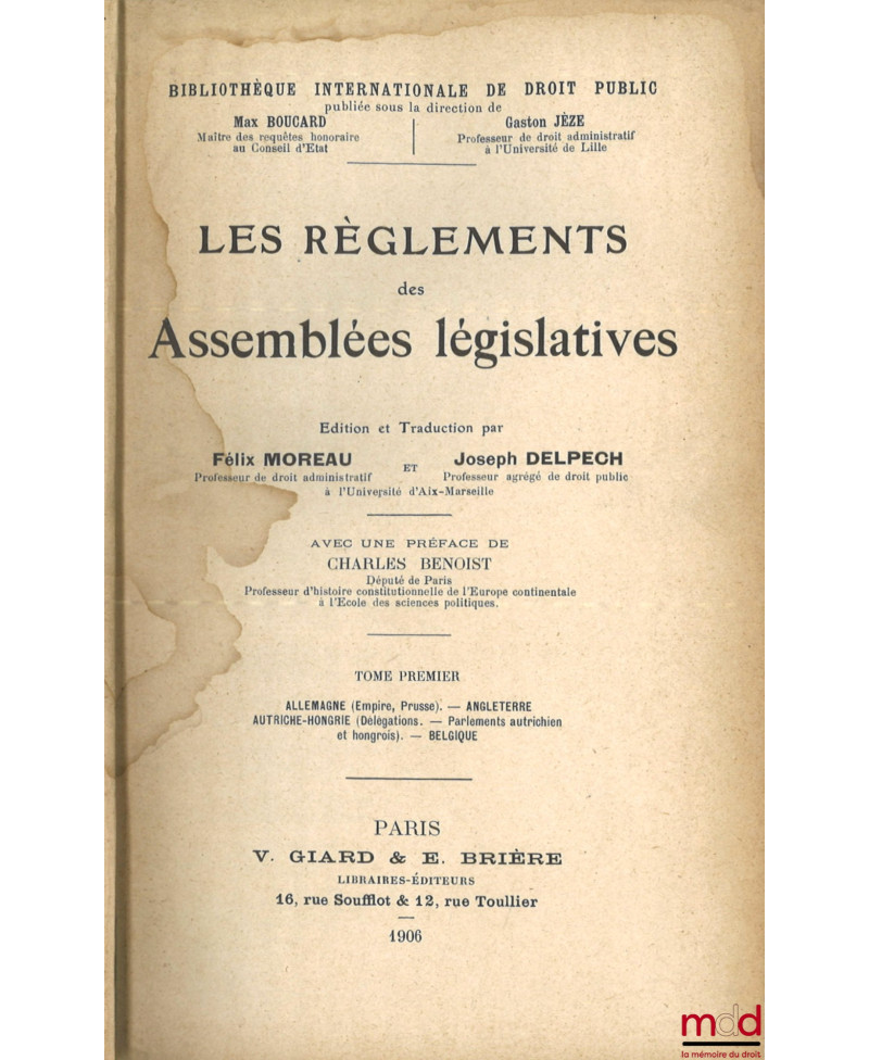 LES RÈGLEMENTS DES ASSEMBLÉES LÉGISLATIVES, Préface de Charles Benoist, t. I [seul] : Allemagne (Empire Prusse) - Angleterre - Autriche-Hongrie (Délégations. - Parlements autrichien et hongrois) - Belgique, Bibl. internationale de Droit public