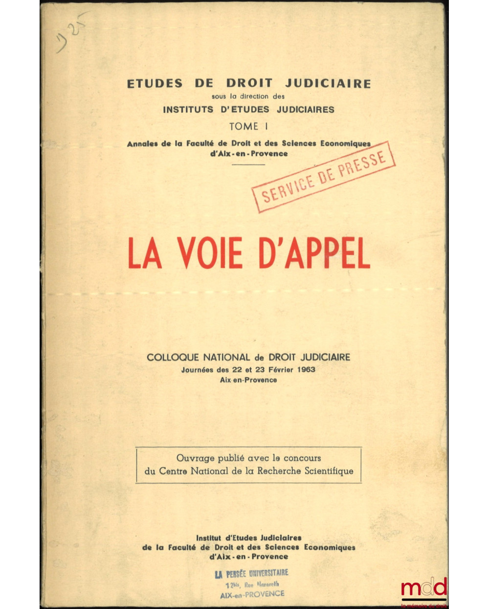LA VOIE D’APPEL, Colloque national de Droit judiciaire, Journées des 22 et 23 février 1963 à Aix-en-Provence, Avant-propos de Jean Boulouis, Annales de la Faculté de droit et des Sc. Éco. d’Aix-en-Provence, t. I