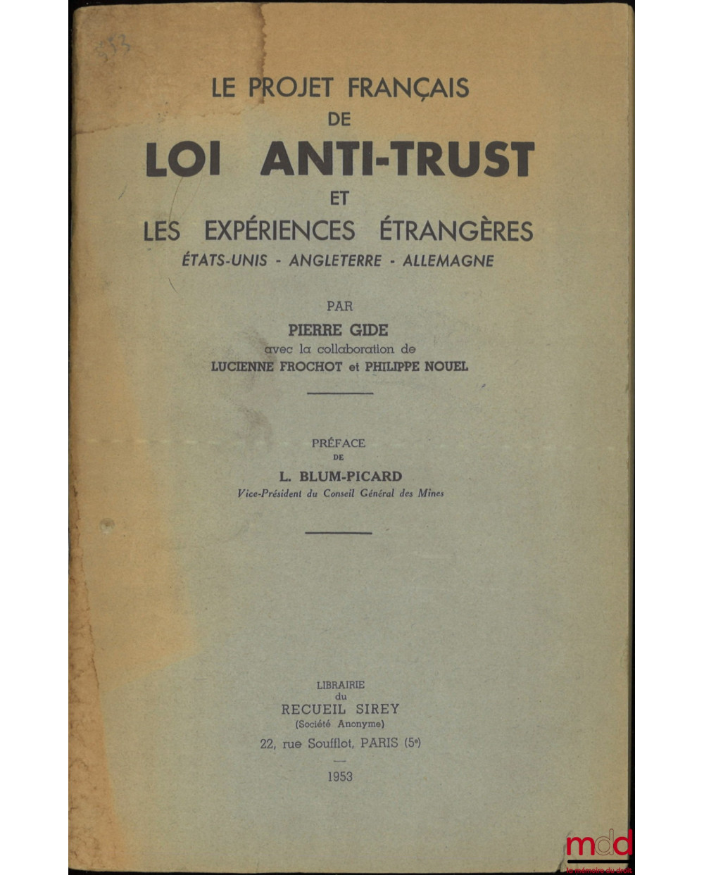 LE PROJET FRANÇAIS DE LOI ANTI-TRUST ET LES EXPÉRIENCES ÉTRANGÈRES (États Unis, Angleterre, Allemagne), Préface de L. Blum-Picard
