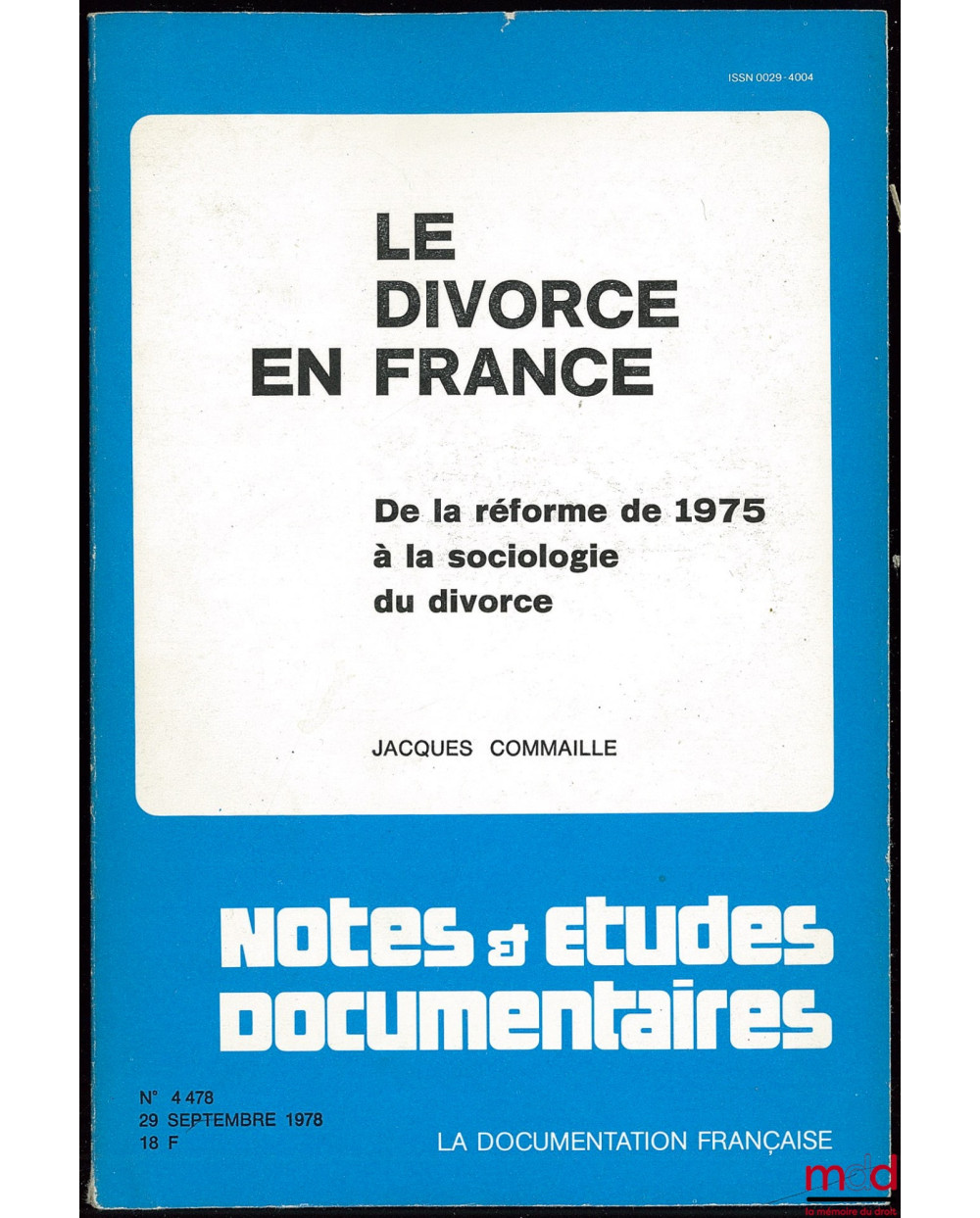 LE DIVORCE EN FRANCE, De la réforme de 1975 à la sociologie du divorce, col. Notes et études documentaires