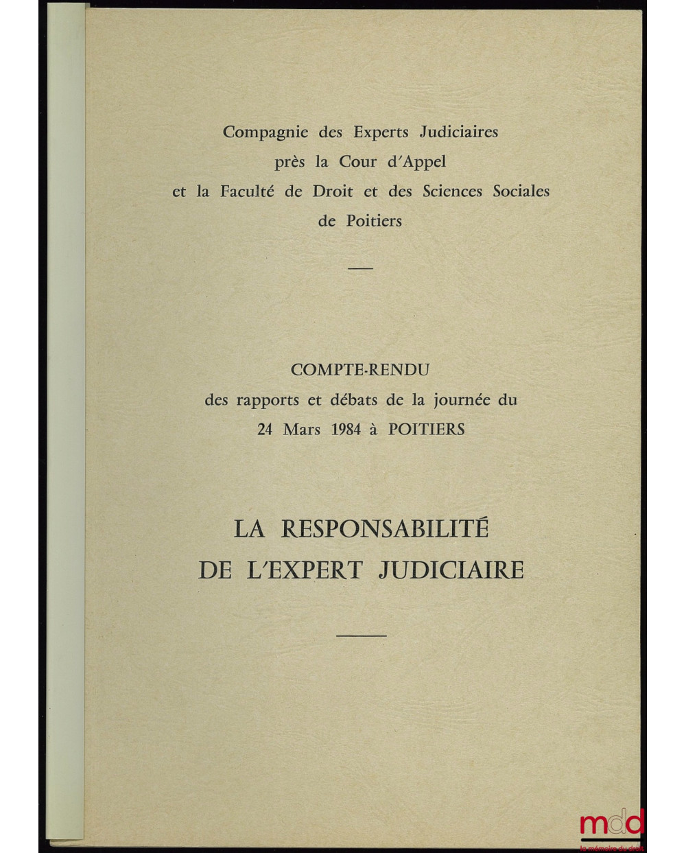 LA RESPONSABILITÉ DE L’EXPERT JUDICIAIRE, Compte-rendu des rapports et débats de la journée du 24 mars 1984 à Poitiers par la Compagnie des Experts Judiciaires près la Cour d’Appel et la Faculté de Droit et des Sciences Sociales de Poitiers, Préface de Gérard Rousseau