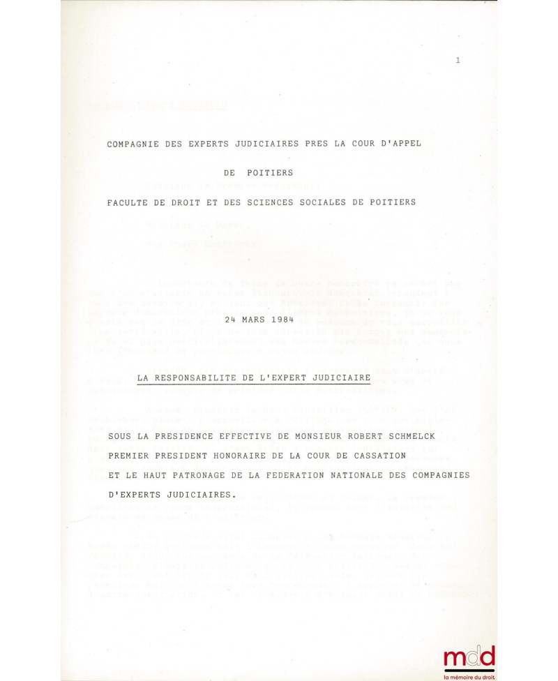 Ont participé : Robert Schmelck, synthèse et conclusion, premier Président de la Cour de cassation ; Yves Madiot, Doyen de la fac. de droit de Poitiers ; Georges Sellon, Président de la fédération nationale des Compagnies d’Experts. Notons les contributions de Jean-Jacques Daigre, La responsabilité civile de l’E. J. - et Jean Pradel, La responsabilité pénale de L’E. J. - Professeurs à la Fac. de droit et des Sciences sociales de Poitiers ; Monsieur Olivier, La responsabilité disciplinaire de l’E. J., Conseiller à la Cour de Cassation.
