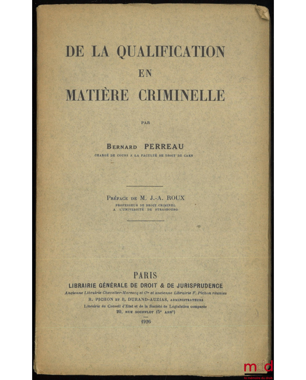 DE LA QUALIFICATION EN MATIÈRE CRIMINELLE, Préface de M. J. -A. Roux