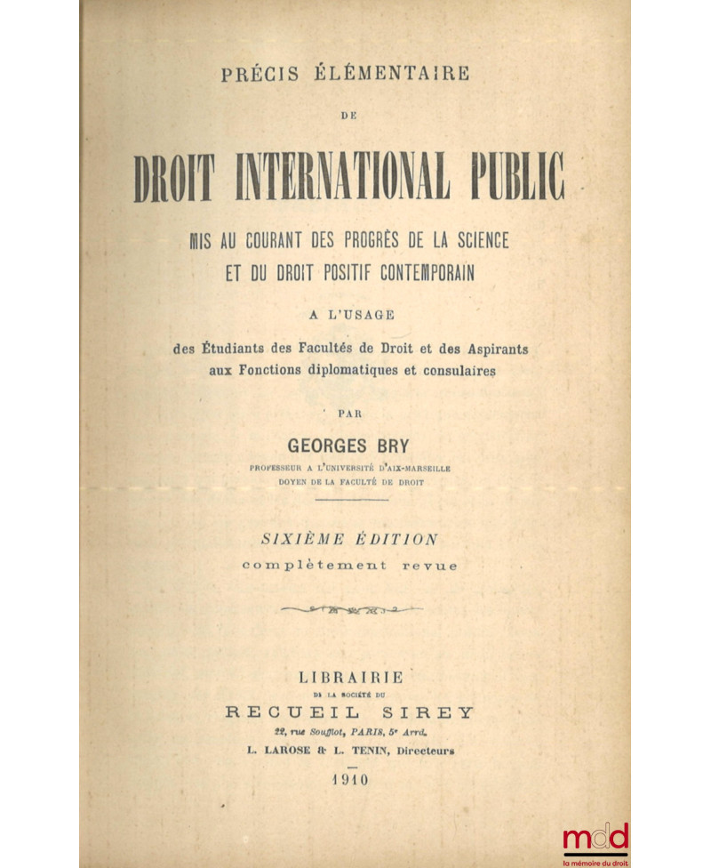 PRÉCIS ÉLÉMENTAIRE DE DROIT INTERNATIONAL PUBLIC mis au courant des progrès de la science et du droit positif contemporain, 6e éd. complètement revue