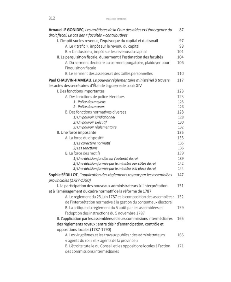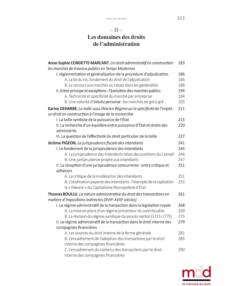 Le droit produit par les administrations d’Ancien Régime n’est pas qualifié de droit administratif par la doctrine de l’époque laquelle, si elle prenait sans doute bien conscience de la spécificité des règles propres à l’Administration, ne les a guère étudiées dans le cadre d’une science administrative. Il est vrai, aussi, que la définition même du droit administratif soulève encore aujourd’hui bien des difficultés et qu’il est compliqué, dès lors, d’établir avec précision quand il est apparu. Pour autant, la conscience de l’existence d’une sphère du droit public, distincte de celle du droit privé, se développe très tôt chez les juristes comme chez les administrateurs ou les administrés. Le fait administratif est donc connu des hommes de l’Ancien Régime.Partant de l’hypothèse, réaliste, que l’Administration de l’ancienne monarchie a aménagé un cadre juridique pour agir et qu’elle produisait donc des normes, cet ouvrage a pour ambition de questionner les textes et les pratiques issus des administrations afin de déterminer leur caractère impératif, leur force contraignante, leur esprit et les principes qui les animent. Il ne s’agit plus de s’interroger sur la réalité du droit de l’Administration d’Ancien Régime, mais plutôt d’en découvrir l’économie et de chercher à savoir comment, et jusqu’où, la monarchie s’est limitée ou a été limitée par le droit. Cette démarche doit permettre d’aller au-delà du régime politique et de la concentration du pouvoir qui lui est propre, d’accepter la réalité du droit produit et observé par les institutions publiques afin de caractériser leur régime administratif. Il s’agit donc d’éclairer l’ordre juridique dans lequel agissaient administrateurs et administrés et de réfléchir à la position qu’occupait l’État royal en son sein. Cette problématique est d’autant plus essentielle qu’elle s’inscrit, pour le XVIIIe siècle, dans un climat d’opposition entre le gouvernement royal et ses commissaires d’un côté, les parlements et leurs officiers de l’autre.