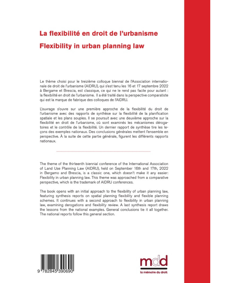 Le thème choisi pour le treizième colloque biennal de l’Association internationale de droit de l’urbanisme (AIDRU), qui s’est tenu les 16 et 17 septembre 2022 à Bergame et Brescia, est classique, ce qui ne le rend pas facile pour autant : la flexibilité en droit de l’urbanisme. Il a été traité dans la perspective comparatiste qui est la marque de fabrique des colloques de l’AIDRU. L’ouvrage s’ouvre sur une première approche de la flexibilité du droit de l’urbanisme avec des rapports de synthèse sur la flexibilité de la planification spatiale et les plans souples. Il se poursuit avec une deuxième approche sur la flexibilité en droit de l’urbanisme, où son examinés les mécanismes dérogatoires et le contrôle de la flexibilité. Un dernier rapport de synthèse tire les leçons des exemples nationaux. Des conclusions générales mettent l’ensemble en perspective. A la suite de cette partie générale, figurent les différents rapports nationaux.The theme of the thirteenth biennial conference of the International Association of Land Use Planning Law (AIDRU), held on September 16th and 17th, 2022 in Bergamo and Brescia, is a classic one, which doesn’t make it any easier Flexibility in urban planning law. This theme was approached from a comparative perspective, which is the trademark of AIDRU conferences. The book opens with an initial approach to the flexibility of urban planning law, featuring synthesis reports on spatial planning flexibility and flexible planning schemes. It continues with a second approach to flexibility in urban planning law, examining derogations and flexibility review. A last synthesis report draws the lessons from the national examples. General conclusions tie it all together. The national reports follow this general section.