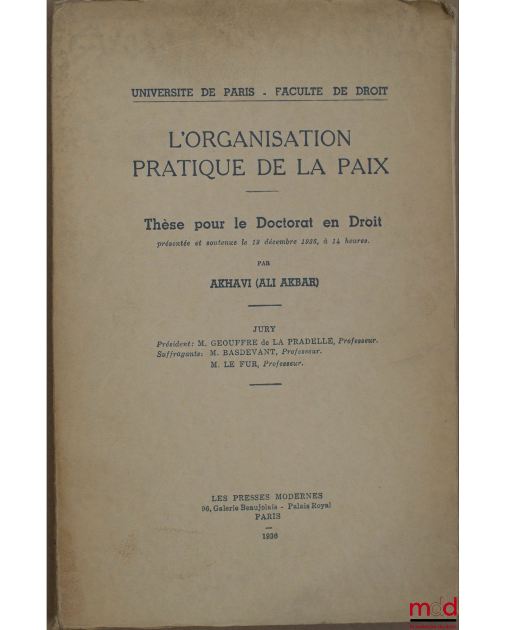 L’ORGANISATION PRATIQUE DE LA PAIX, Faculté de droit de l’Université de Paris