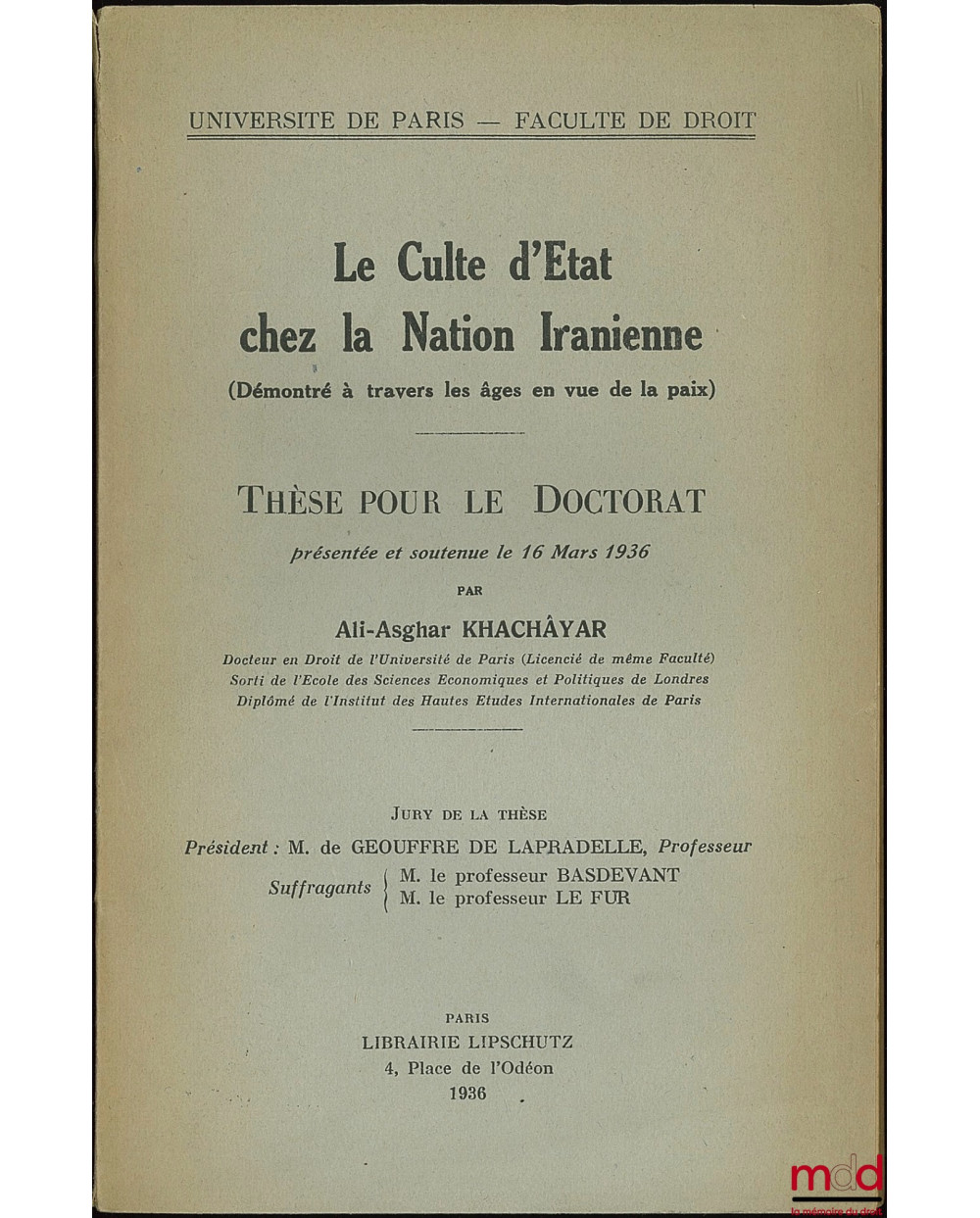 LE CULTE D’ÉTAT CHEZ LA NATION IRANIENNE (démontré à travers les âges en vue de la paix), Université de Paris, Faculté de droit