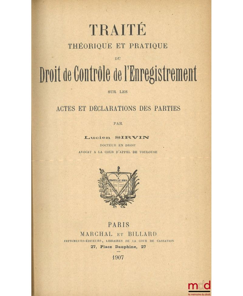 TRAITÉ THÉORIQUE ET PRATIQUE DU DROIT DE CONTRÔLE DE L’ENREGISTREMENT SUR LES ACTES ET DÉCLARATIONS DES PARTIES