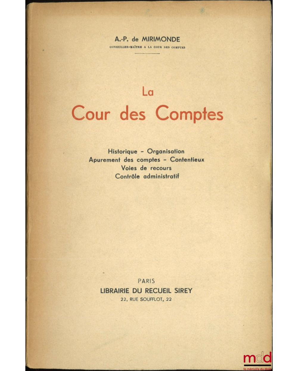 LA COUR DES COMPTES, Historique - Organisation - Apurement des comptes - Contentieux - Voies de recours - Contrôle administratif