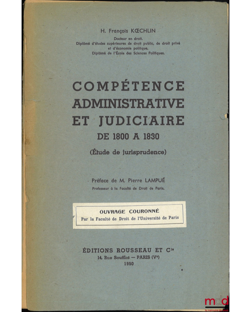 COMPÉTENCE ADMINISTRATIVE ET JUDICIAIRE DE 1800 À 1830 (Étude de jurisprudence), Préface de Pierre Lampué