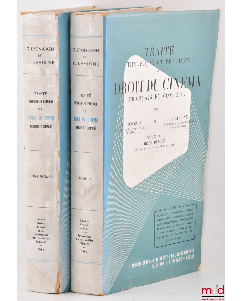 TRAITÉ THÉORIQUE ET PRATIQUE DE DROIT DU CINÉMA FRANÇAIS ET COMPARÉ, Préface de Henri Desbois ; t. I : Organisation professionnelle - Censure - Droits d’auteur - Adaptation - Centre National du Cinéma - Statuts des techniciens et des artistes ; t. II : Production - Distribution - Exploitation - Crédit - Contrats - Fiscalité - Fonds de développement - Coproduction - Échanges internationaux - Index alphabétique - Tables des documents et des espèces de jurisprudence