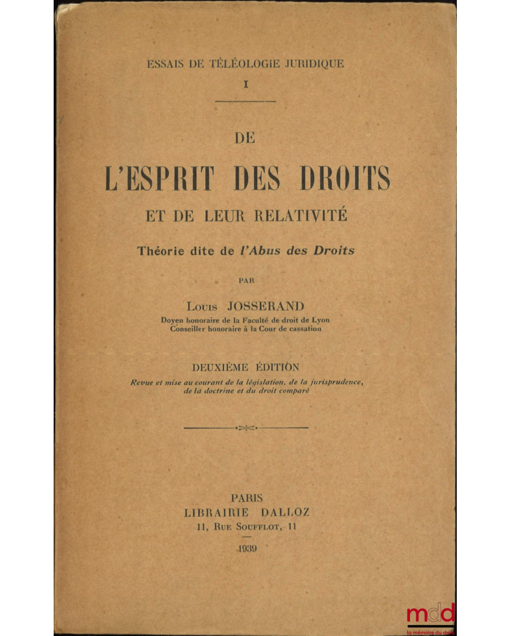 DE L’ESPRIT DES DROITS ET DE LEUR RELATIVITÉ, THÉORIE DITE DE L’ABUS DES DROITS, 2e éd. revue et mise au courant de la législation, de la jurisprudence, de la doctrine et du droit comparé, coll. Essais de téléologie juridique, n° 1