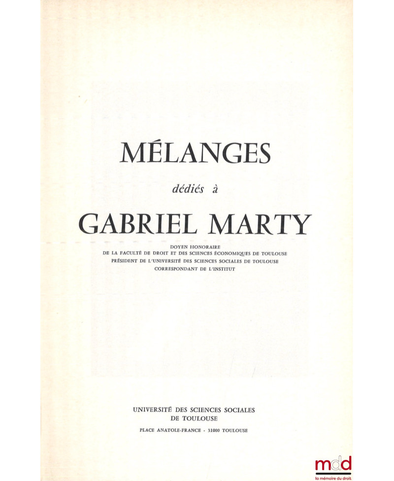 MÉLANGES DÉDIÉS À GABRIEL MARTY, Préface de Jacques Maury
