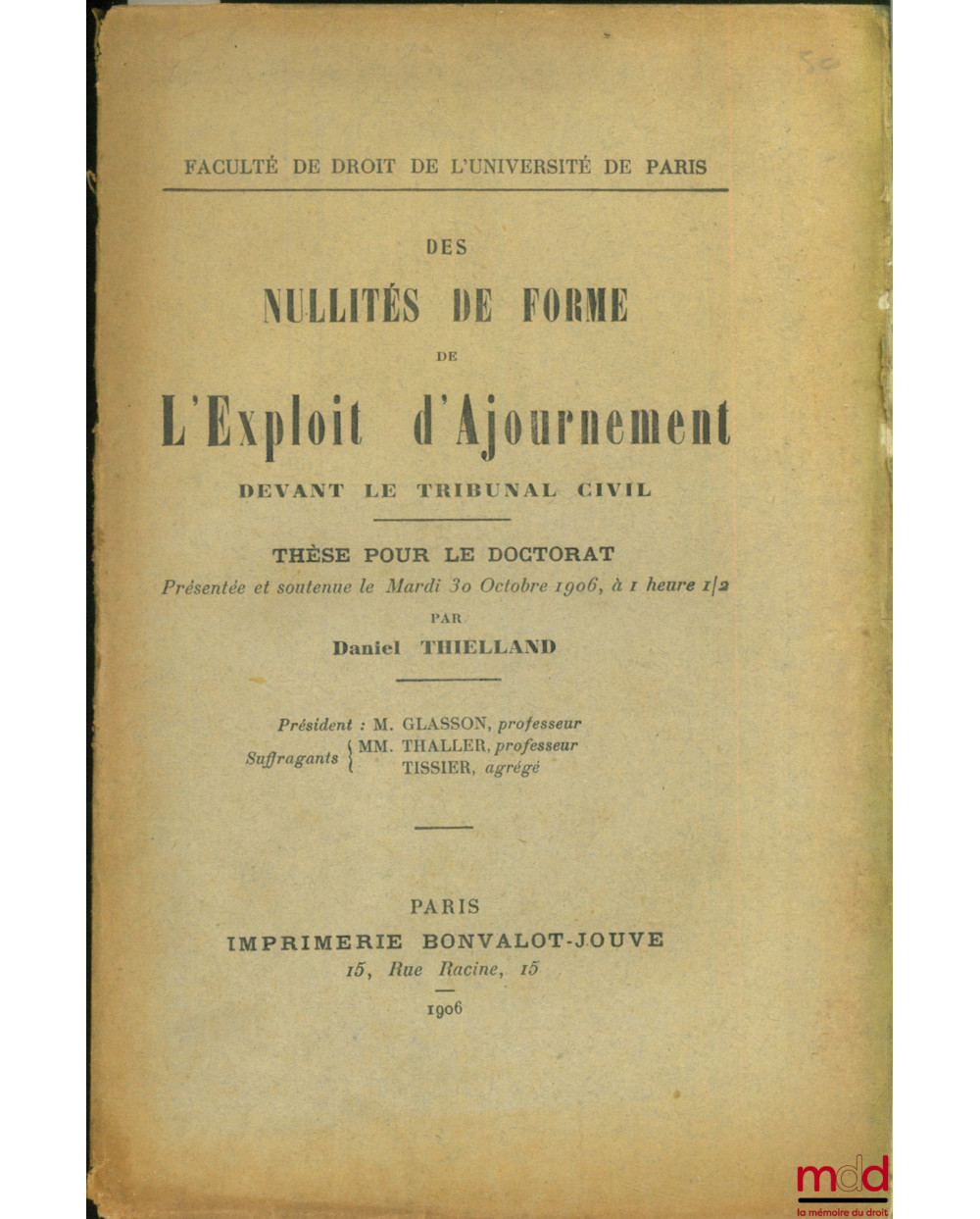 DES NULLITÉS DE FORME DE L’EXPLOIT D’AJOURNEMENT DEVANT LE TRIBUNAL CIVIL, Faculté de droit de l’Université de Paris