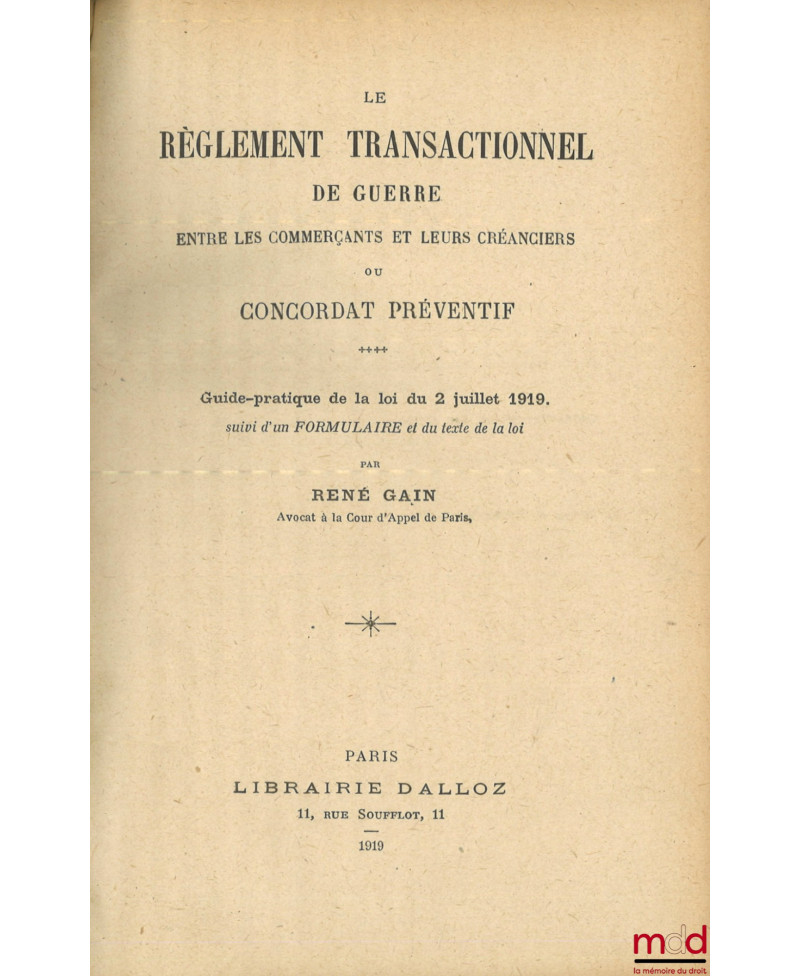 LE RÈGLEMENT TRANSACTIONNEL DE GUERRE ENTRE LES COMMERÇANTS ET LEURS CRÉANCIERS OU CONCORDAT PRÉVENTIF, Guide-pratique de la loi du 2 juillet 1919 suivi d’un formulaire et du texte de la loi