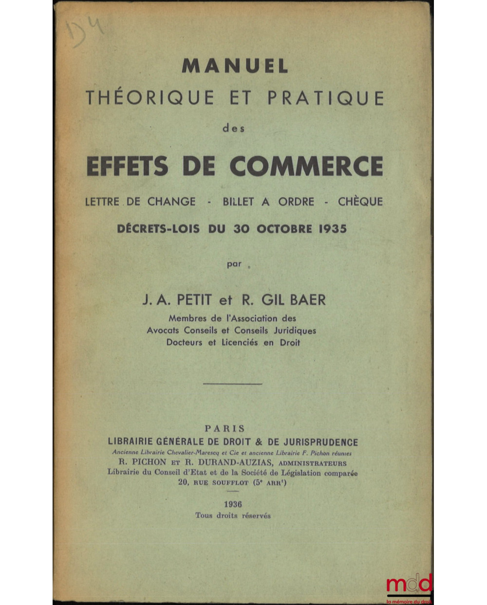 MANUEL THÉORIQUE ET PRATIQUE DES EFFETS DE COMMERCE, Lettre de change - Billets à ordre - Chèque, Décrets-lois du 30 octobre 1935